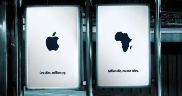 한 사람이 죽으면, 백만 명이 운다. 백만 명이 죽지만, 아무도 울지 않는다. 고인 스티븐 잡스의 죽음으로 세계가 슬픔에 빠졌을 때 나온 공익 광고입니다. 물론 세계의 혁명을 가져온 인재 스티븐 잡스의 죽음도 안타깝지만, 아프리카에서 죽어가는 수많은 목숨들에게도 관심을 가져달라 이겁니다. 처음에 이 광고를 보았을 때에는 왜 스티븐 잡스를 꼭 집었을까? 너무 시의성이 강해서 반감을 줄 수 있는 건 아닐까? 라고 생각했지만, 곱씹으면 곱씹을수록 아프리카인들이 느끼는 냉혹한 현실을 직설적으로 잘 표현한 것 같더라고요. 다소 논쟁거리가 될 가능성도 있는 것 같지만, 우리가 한번씩 곱씹을 만한 카피인 것 같아서 가져왔습니다.