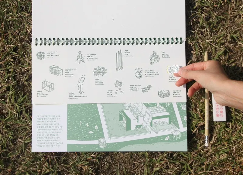 경기도미술관 야외조각공원 스케치북 디자인. 첫 장에 야외조각 작품 스티커를 두어 공원 지도 위에 붙일 수 있도록 디자인하였다