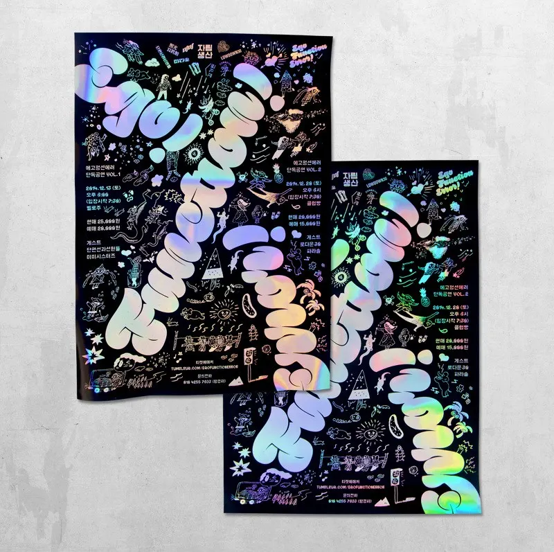 이 : 에고펑션에러의 포스터는 저희에게 굉장히 의미가 있어요. 보시는 것처럼 홀로그램방식으로 인쇄를 했거든요. 쇼케이스 전에 이 포스터를 여기저기 많이 붙였는데 사람들이 마음에 들었는지 전부 떼어가셨어요. 이 포스터가 인기가 많아지면서 저희 스튜디오에 홀로그램 방식의 작업을 의뢰하시는 경우도 늘어났지요. 어떻게 보면 저희 아이덴티티가 된 첫 번째 작품과 같아서 굉장히 의미 있고 고마운 포스터예요.