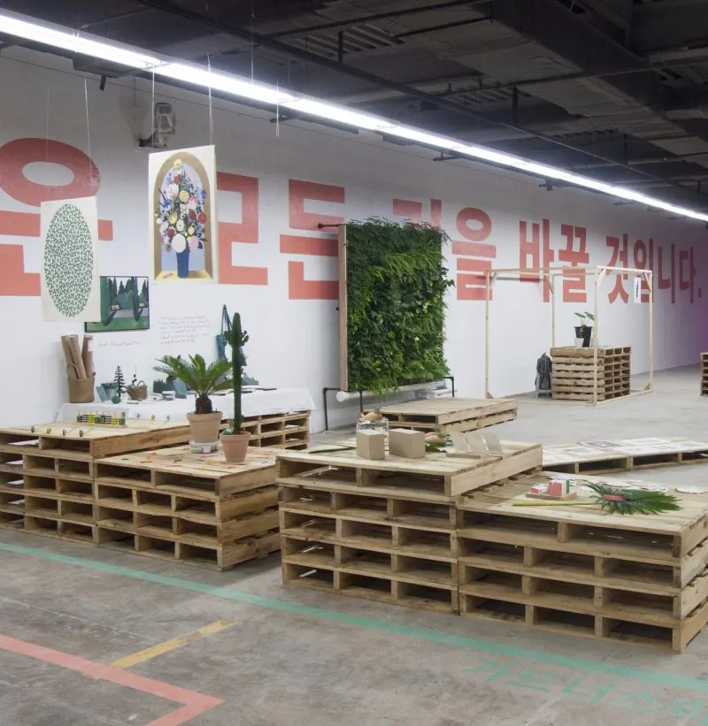 광주디자인비엔날레 5관에 전시된 가드너스 마켓 공간. 5관 공간의 벽면 타이포그래피와 바닥 동선 사인도 함께 진행했다