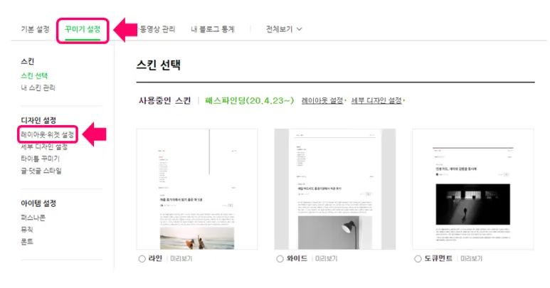 내 블로그의 메뉴 배치(레이아웃), 디테일한 디자인 설정, 위젯 추가와 제거를 할 수 있는 화면이 나타납니다.