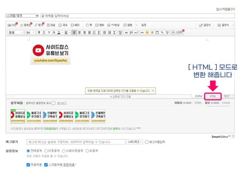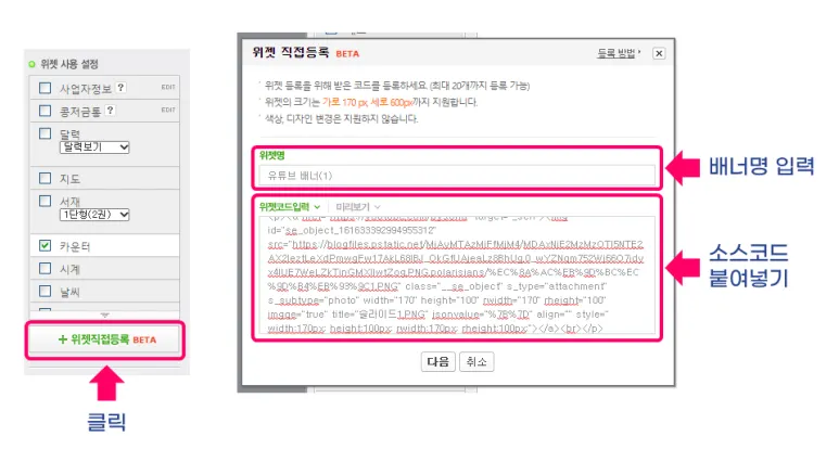 4. 배너 이름을 입력해 주세요. 그리고 아래에 앞서 복사해온 배너 소스코드를 붙여넣기(단축키 Ctrl + V)하세요.