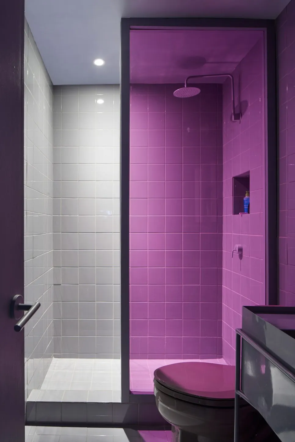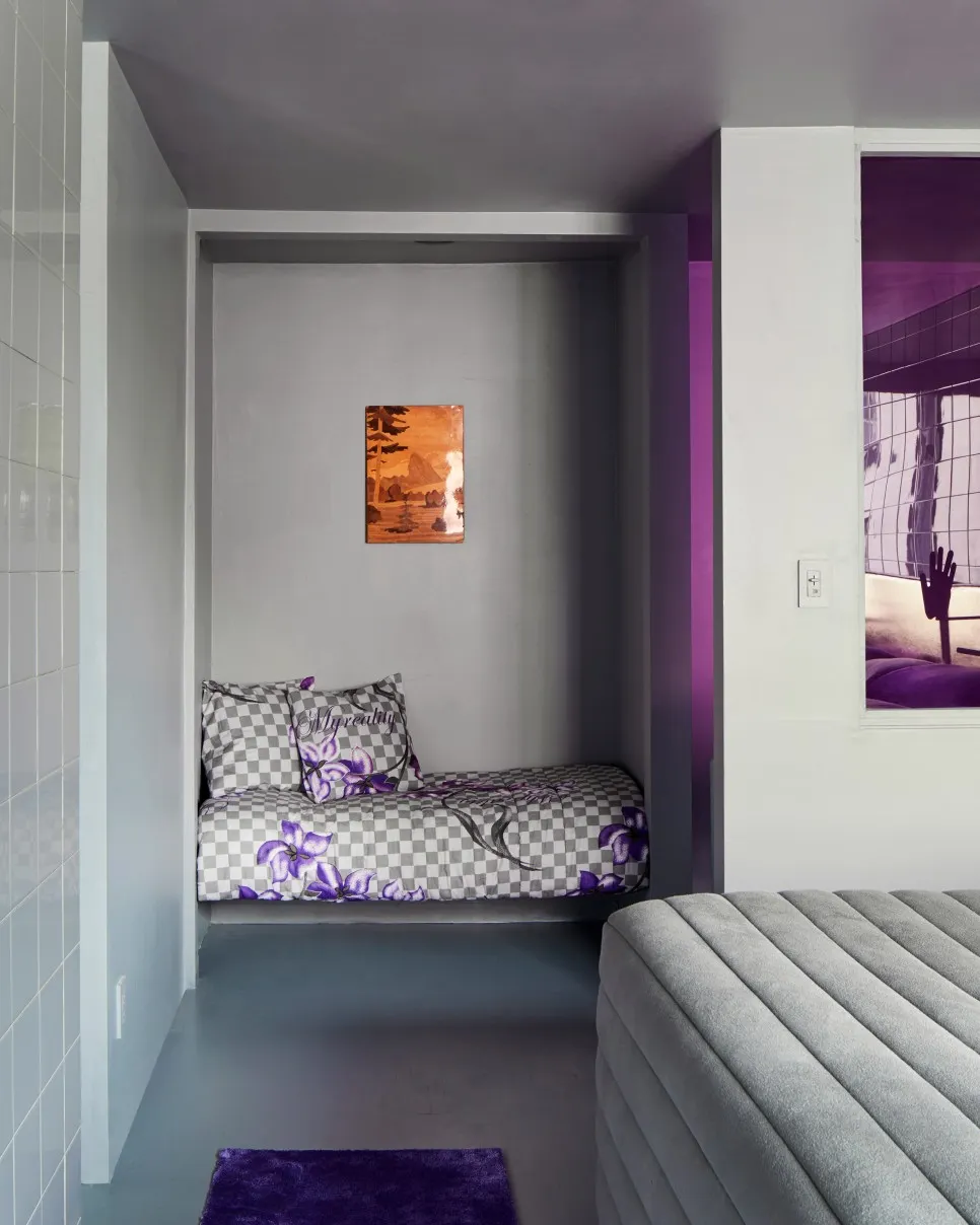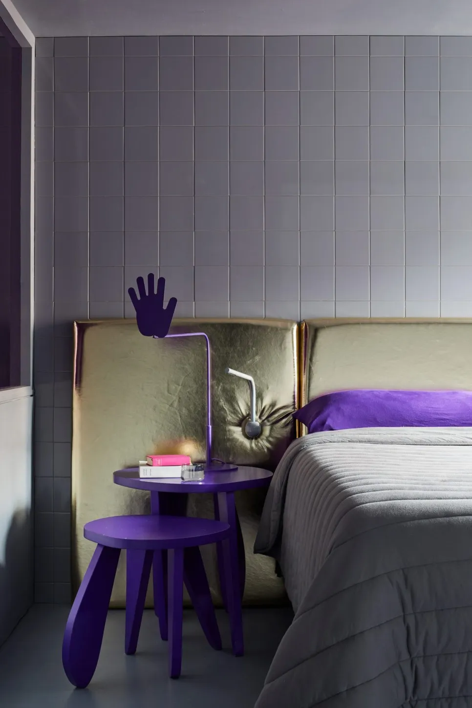가장 먼저 눈에 들어오는 것은 당연 보라색. 거실을 가득 메우는 보라색 카펫은 단번에 시선을 사로잡는다. 거실 벽의 한 면은 타일로 마감해 평범함을 거부했고, 작은 스툴을 쌓아올린 듯한 진한 보라색의 책장은 밋밋한 벽에 가구이자 장식이 된다. 보라색의 강렬함을 살짝 차분하게 보이도록 밸런스를 맞춰주는 밝은 회색은 보라색이 아닌 모든 곳에 쓰였다고 해도 과언이 아니다.