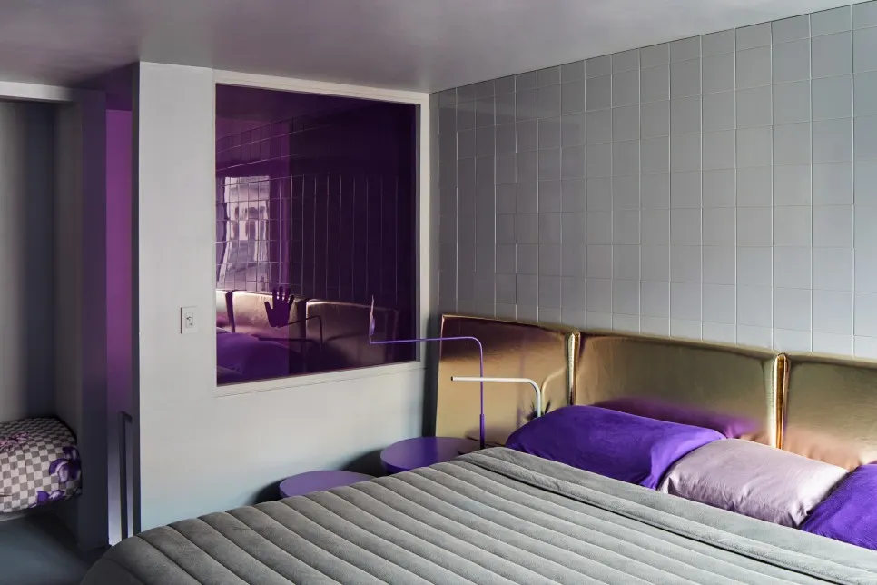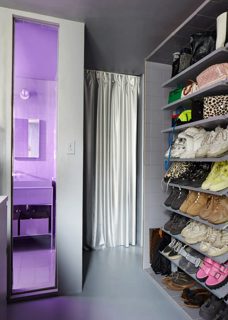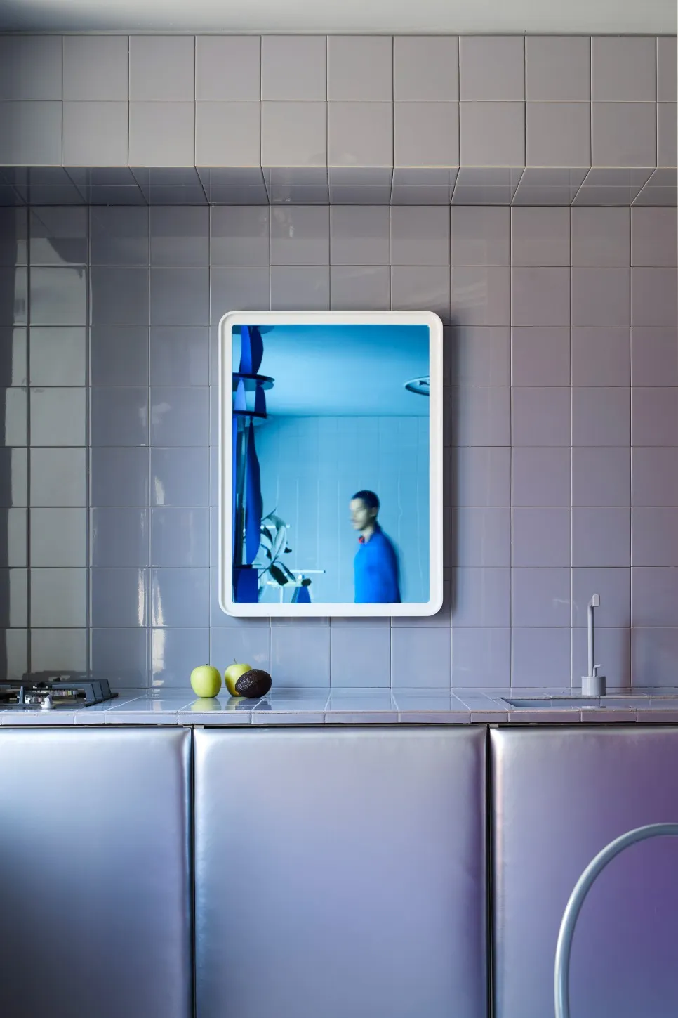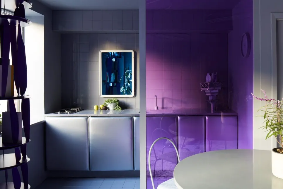 부엌과 식탁 경계 부분에는 보라색 틴트 글라스로 처리해 시각적으로 상호작용하는 공간이 탄생했다. 부엌 캐비닛은 비건 가죽으로 맞춤 제작됐고 밋밋한 부엌 벽에 걸린 거울은 푸른 색감이 들어가 몽환적인 분위기를 연출한다. 똑같은 방식이 화장실 샤워공간에 적용됐다. 습한 공간과 건조한 공간을 나누는 옅은 보라색 유리가 색다른 분위기를 만든다.