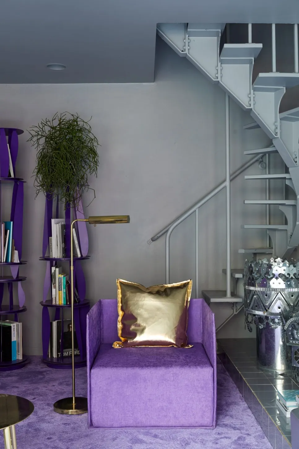 책장과 같은 디자인의 스툴. 베갯잇도 보라색으로 특수 제작했다. 사진 출처ㅣ딜런 챈들러, 크로스바이 스튜디오