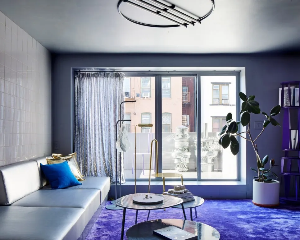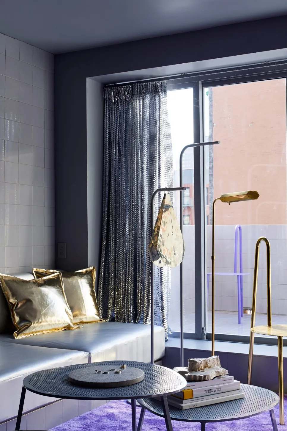 전체적으로 아주 강렬하고 튀는 보라색이 아파트를 지배하고 있음에도 금색과 은색의 반짝거리는 재질들의 가구와 인테리어 소품이 사용됐다. 하나하나 개성 강한 제품들이 조화를 이룬다는 게 신기하게 느껴질 정도. 집안 곳곳에 놓인 식물은 조금이나마 집에 따스한 분위기를 불어넣어 주고 있다.