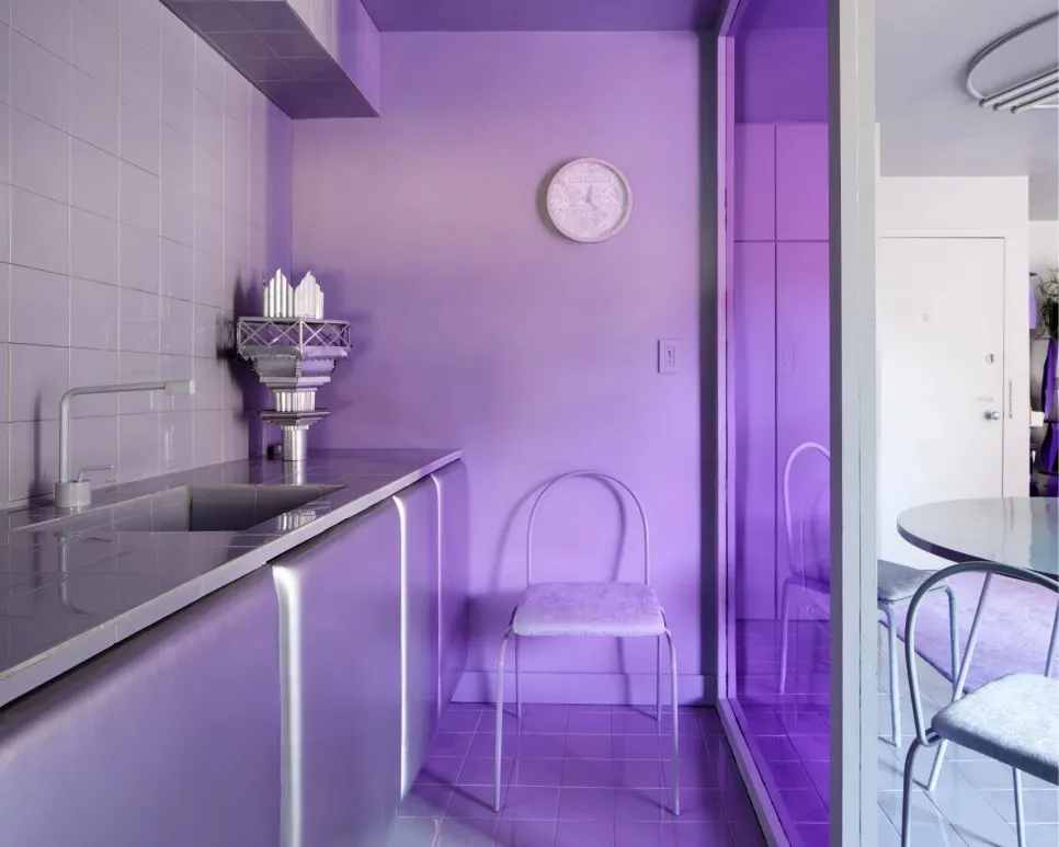 보라색 틴트 유리가 사용된 부엌과 식탁 공간