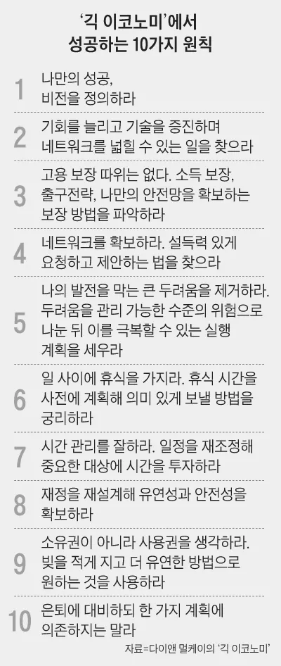 직업(job)의 개념이 변한 것일까. "나는 한 개의 일자리에 풀타임으로 근무하는 사람의 일에 직업(job)이라는 표현을 쓴다. 독립적인 일을 하거나 차량공유 업체 우버와 같은 플랫폼 노동자의 일은 ‘긱’ ‘사이드긱’ ‘일(work)’이라는 표현을 쓴다."
