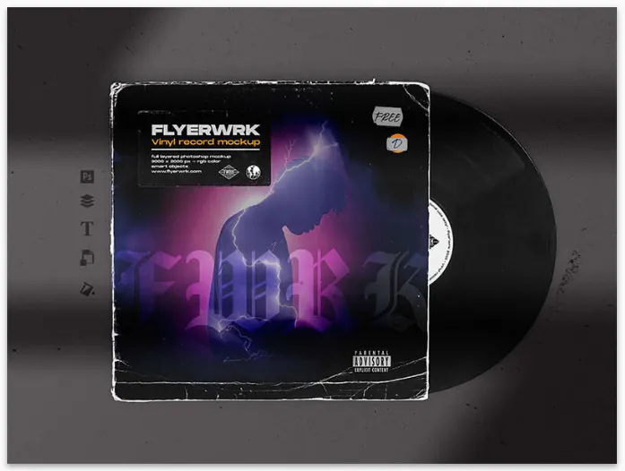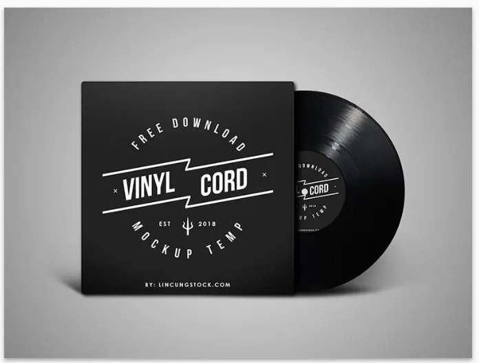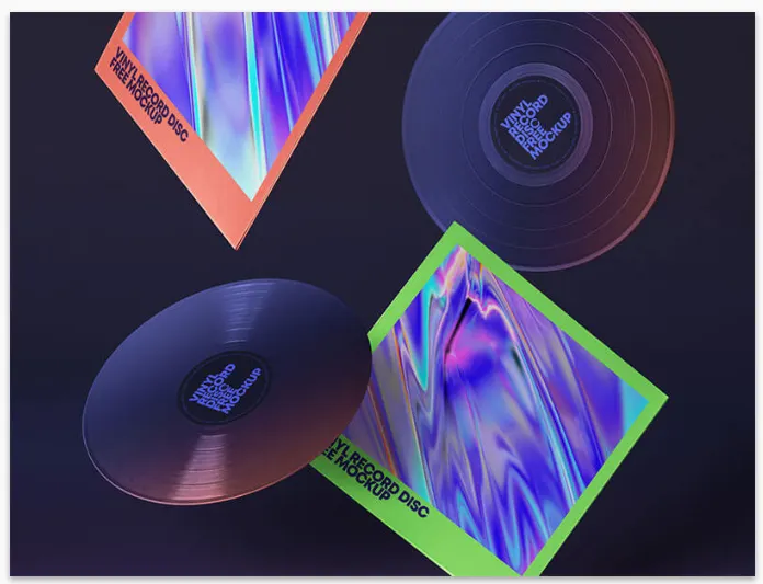 무중력에 떠있는 레코드 판과 커버 재킷 모형 복고풍 디자인 목업