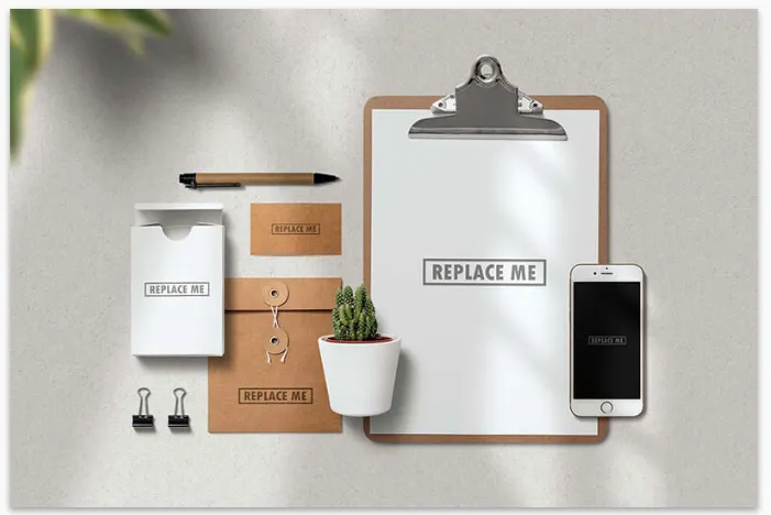 스마트 폰과 봉투, 명함, 패키지 등 문구 상품 이외에