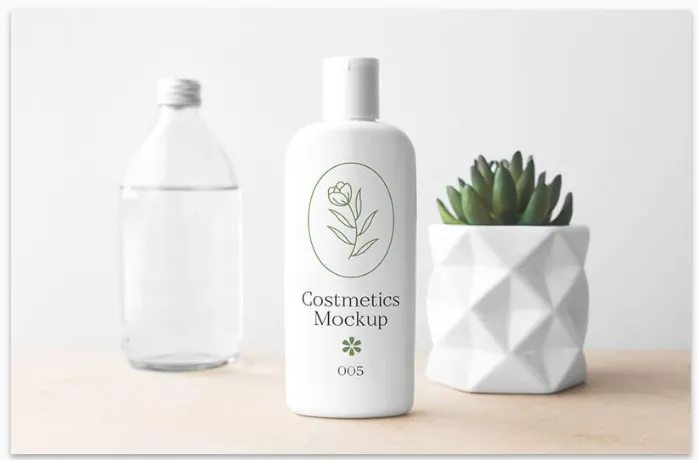 화장품, 화장품 병을 표현한 소재로 배경에 놓인 관엽 식물과 투명 병이 세련된 분위기.