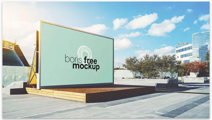 공원에서 열리는 야외 이벤트 무대의 배경인 광고 디스플레이용 목업