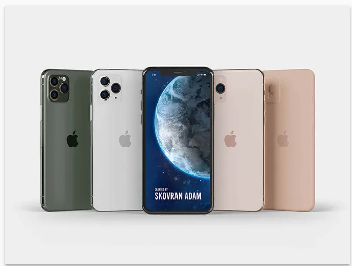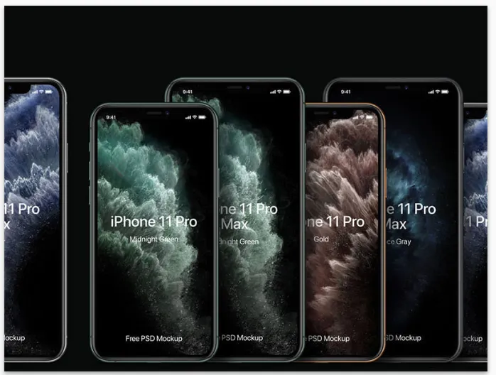 iPhone 11 Pro 컴플리트 세트. 그린, 핑크, 화이트 등 전체 색상 컬러가 조화롭게 정렬된 목업입니다.
