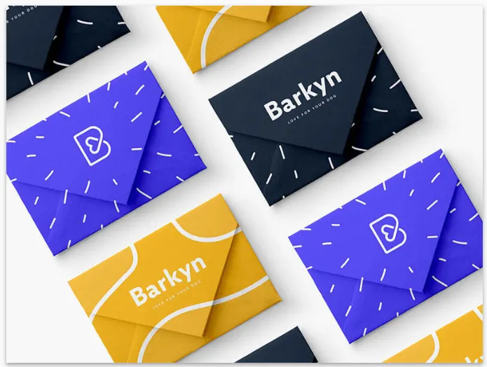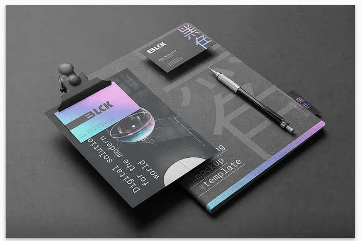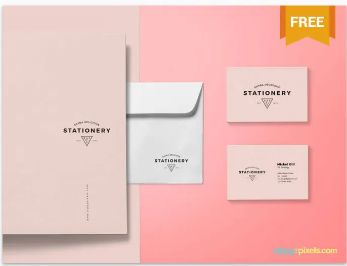 레터 헤드 및 파일 커버, 봉투, 명함 등을 갖춘 문구 세트.