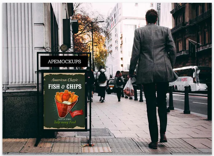 카페 앞 길거리에 서있는 메뉴판, 포스터 간판을 디자인 할 수 있는 목업