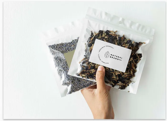 파우치 가방에 포장된 허브티의 레이블을 만들수있는 목업