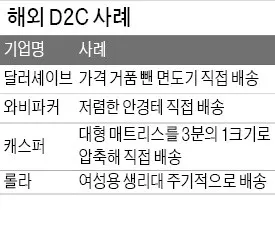 D2C 기업들은 라이프 스타일까지 바꿔놓는다는 평가도 나온다. 매트리스업체 캐스퍼는 뉴욕 사람들의 매트리스 구매 방식을 바꿨다는 평가를 받는다. 맨해튼에 사는 사람이 온라인으로 주문하면 매트리스가 60분 만에 배달된다. 가격은 경쟁 제품의 3분의 1이다. 부피 때문에 배송이 어려운 매트리스를 압축해 작은 상자에 넣어 보내주는 것도 이 회사만의 특징이다.
