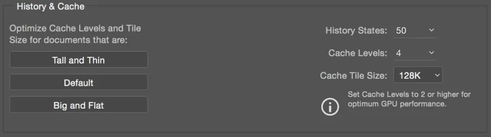 또, 작업 내역 및 캐시에 대한 설정 조정이 가능합니다. 작업내역을 되돌릴 수 있는 갯수를 나타내는데요.