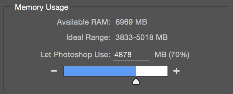 다음에 있는 기본 설정에 대한 내용은 "성능(Performance)"탭에서 확인 가능합니다. 현재 사용하고 있는 윈도우, 프로그램 들을 제외한 Photoshop 에서 사용할 수 있는 설정치에 대한 내용이 확인 가능합니다. 다른 프로그램과 함께 사용하시는 일이 많기에 보통 70%의 수치로 사용하시면 적당합니다.