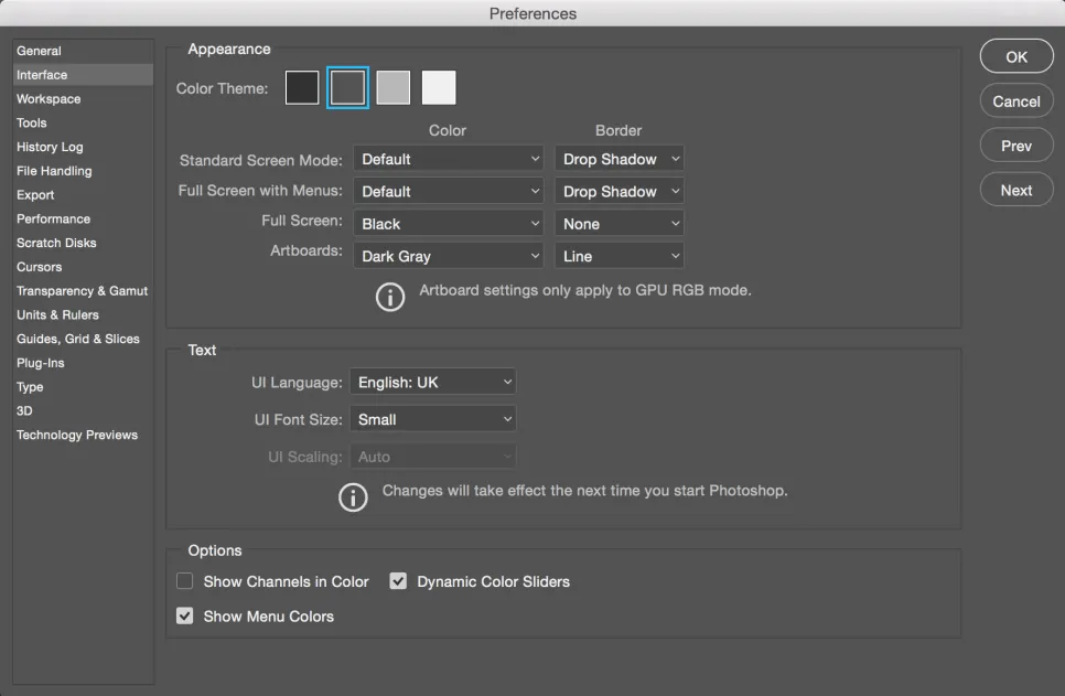 [편집] 탭 안에 [환경 설정] 에서 두번째칸에 위치한 "인터페이스" 환경에서는 사용자 각각의 취향에 따라 포토샵 기본 색을 변경 하실수 있는 장점이 있습니다. 글루오니는 어두운 회색으로 선택을 해준 상태입니다. 좀 더 고급스러운 느낌을 줄 수 있습니다.